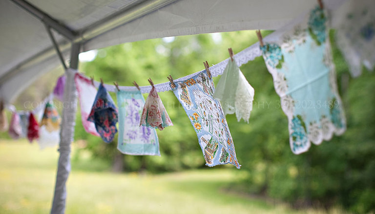 One side of the tent was decorated with vintage handkerchiefs, pinned on a lace clothesline: