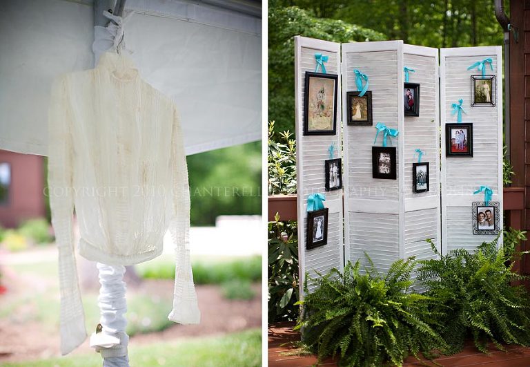 Pieces of Emily’s grandmother’s wedding dress hung in the tent as well – and family wedding pictures hung on distressed shutters nearby: