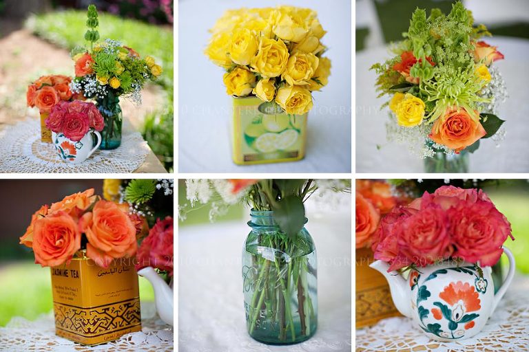 Remember when I said Emily made her own bouquet? Well that creative little bugger also DIY’d her centerpieces – using tea canisters, Mason jars, old bottles, and a teapot as containers: